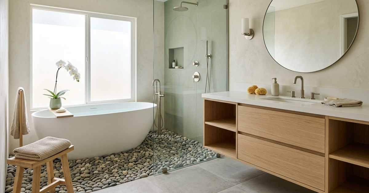 Combine with natural stone textures like slate or river rock, and warm cedar or teak accents. This design promotes a profound sense of calm and well-being, enhancing the bathroom design for relaxation.