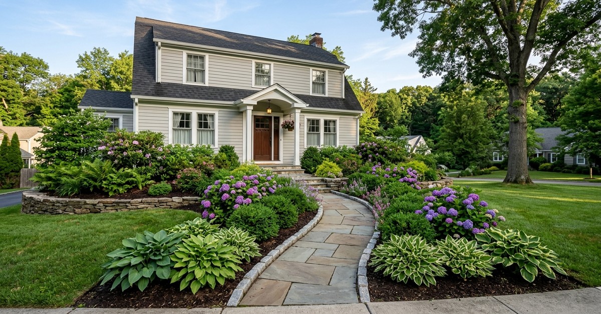 Tiered landscaping with hydrangeas and hostas, framing a home's facade and a clear pathway.