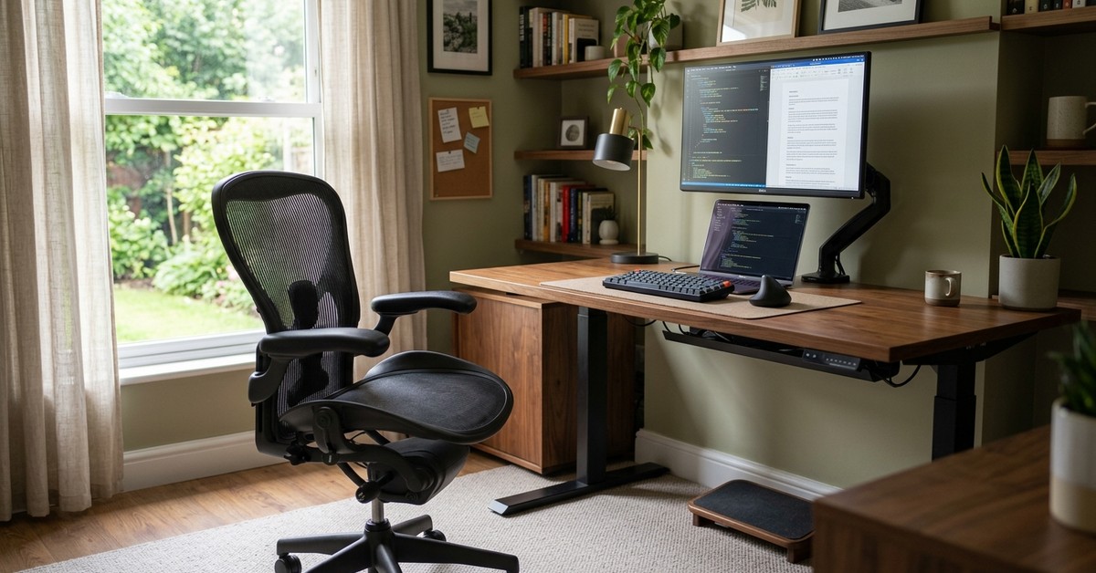 Ergonomic home office featuring a comfortable, supportive chair and a desk at the correct height for good posture and reduced strain.