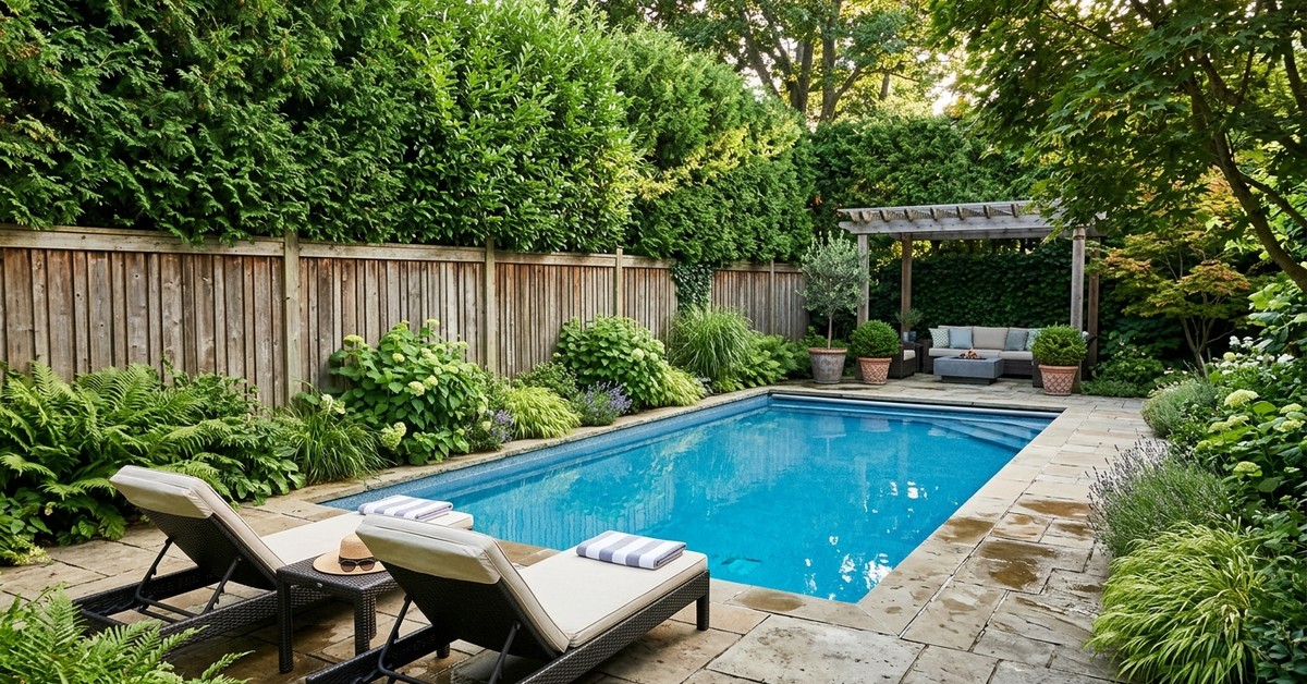 Layer lush greenery, tall hedges, or a slatted wooden fence to create a sense of seclusion. This provides visual privacy and helps absorb ambient noise, enhancing the calm atmosphere of your serene backyard pool retreat. Consider the soothing rustle of bamboo or tall ornamental grasses.