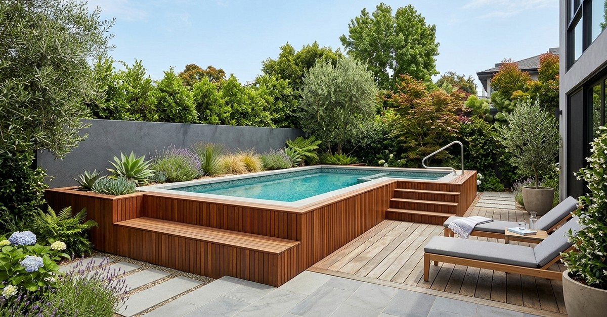 Consider a design where one side of the pool aligns with a lower deck for easy entry, while a higher deck provides a stunning vantage point. Warm cedar or composite decking paired with a dark-tiled pool interior can create a sophisticated, inviting aesthetic. These compact pool ideas are great for entertaining.
