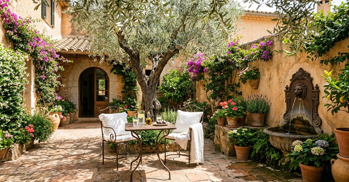 Mediterranean courtyard with terracotta tiles, stucco walls, wrought iron furniture, olive tree, and wall fountain.